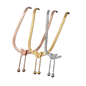 KISSWIFE Trendy Stainless Steel Frosted Butterfly Pendant Necklace with Tassel Snake Bone Chain Clavicle Jewelry for Party Gift